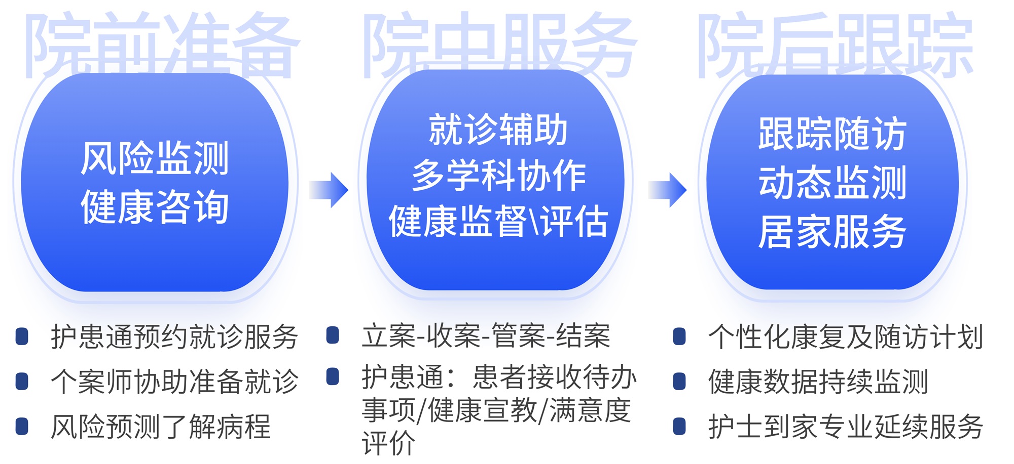 针对医养服务衔接需求,全病程个案管理实现院前准备、院中服务、院后跟踪的全病程管理服务,为具有复杂、慢性或多重健康需求的个体或家庭提供整体性、连续性和协调性的医疗照护服务。