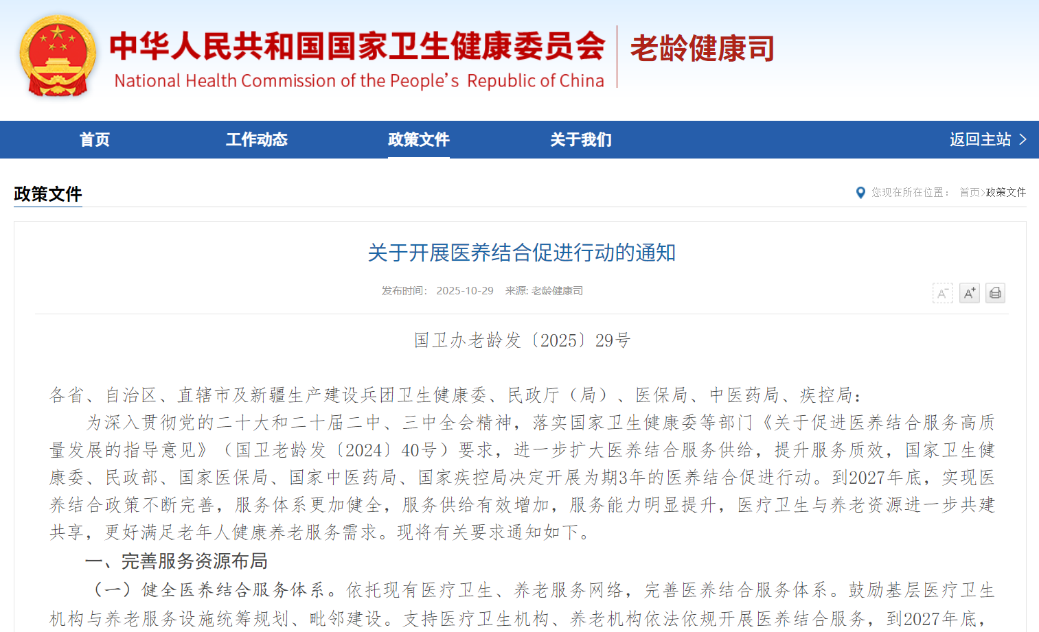 国家卫生健康委等五部门于2025年10月11日联合发布的《关于开展医养结合促进行动的通知》(国卫办老龄发〔2025〕29号),是继《关于促进医养结合服务高质量发展的指导意见》后,在“十四五”中后期推动医养结合事业落地的又一关键行动指南。